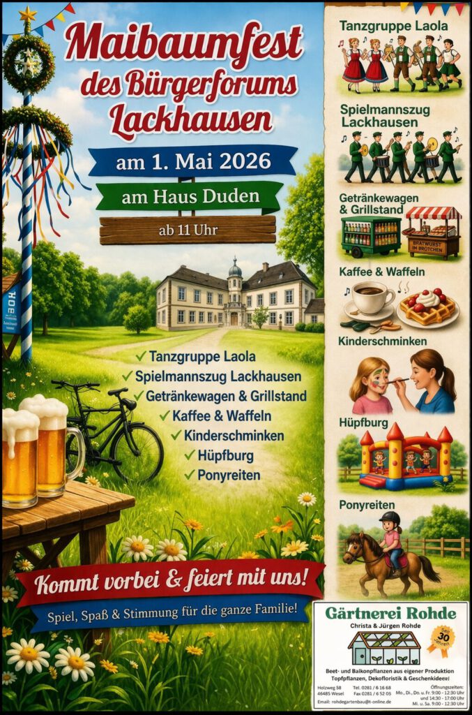 Am 1. Mai 2026 lädt das Bürgerforum Lackhausen alle Bürgerinnen und Bürger herzlich zum Maibaumfest am Haus Duden ein. Ein fröhlicher Tag voller Musik, Tanz und Gemeinschaft erwartet alle.